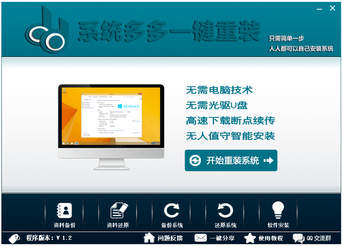 系统多多一键重装是一款功能强大的系统重装软件。该软件不需要U盘和光驱,只要电脑可以联网,就可以自己安装系统。该软件支持WinXP、Win7、Win8、Win10等操作系统,你只需要根据安装提示就可以完成安装,哪怕你是小白也可以轻松装机啦,只需简单一步,人人都可以自己安装系统!