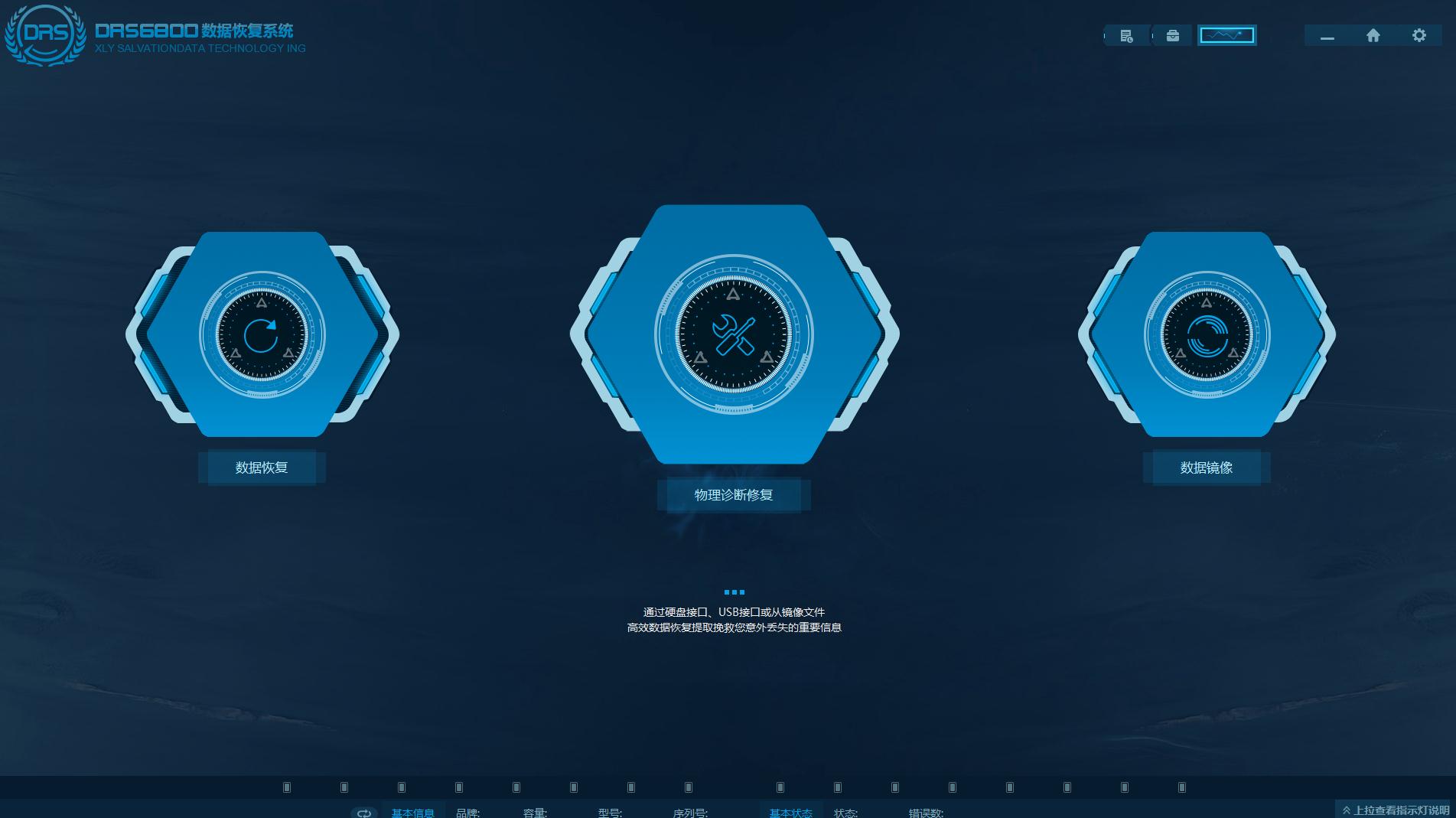 DRS6800数据恢复系统是一款十分优秀的数据恢复软件,界面简洁大方,功能强大,能够帮助用户恢复电脑已经删除的数据,界面显示三个功能,分别是数据恢复、物理诊断修复、数据镜像,使用起来简单便捷。