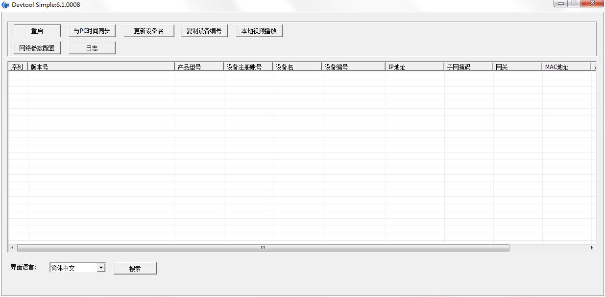 Devtool Simple是款针对电脑中网络工具ipc所打造的配置管理工具,可自动搜索检测局域网中神州鹰的DVS和IPC网络摄像机,为你复制设备编号后通过远程监控终端进行注册,包括重启、与PC时间同步、更新设备名、复制设备编号、本地视频播放、网络参数配置、日志等选项,可查看序列、版本号、产品型号、设备注册账号、设备名、设备编号、IP地址、子网掩码、网关、MAC地址等信息,可自定义切换界面语言等。