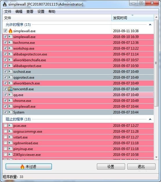 1、下载解压后运行simplewall程序,第一次打开时默认是未启用防火墙的(状态栏的图标是灰色),点一下下面的“未过滤“按钮,启用防火墙;