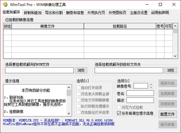 WimTool是一款功能齐全、操作简易的win映像处理工具,可以为用户提供对wim格式文件最常用的处理功能,如挂载映像、解开Wim映像到硬盘的目录、制作映像文件等等,满足用户的基本需求。软件界面直观,采用分页式设计,每页都设有操作说明、选项要求和注意事项,简单易上手。