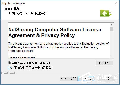 2、进入Xftp 6安装许可协议界面,勾选【我接受许可协议中的条款】,然后点击【下一步】;