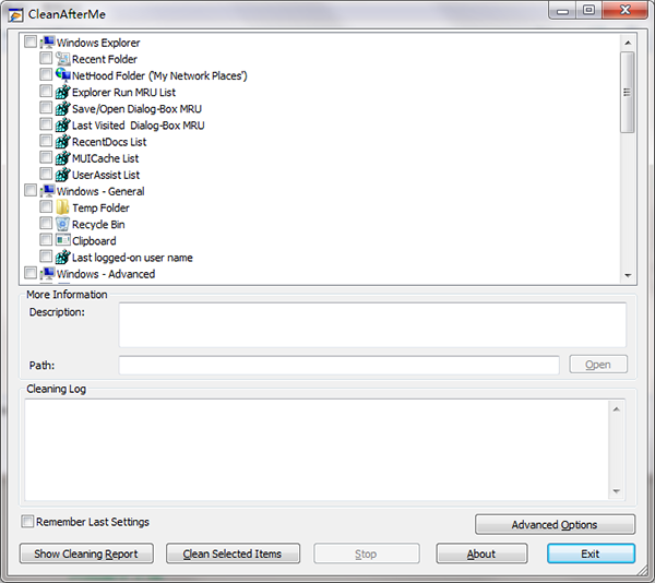 使用CleanAfterMe,您可以清理Internet Explorer的cookie /历史记录/缓存/密码,“最近”文件夹,记录最后打开的文件的注册表项,Windows的临时文件夹,事件日志,回收站等 。