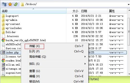 远程上传目录和本地上传文件确认好后,选中本地上传的文件后鼠标右键单击 “传输”。