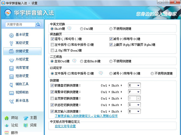 紫光拼音输入法自定制功能。用户可以定制输入习惯、双拼编码、输入界面、模糊音设置、中文符号输入、以及定制输入法的智能特性。