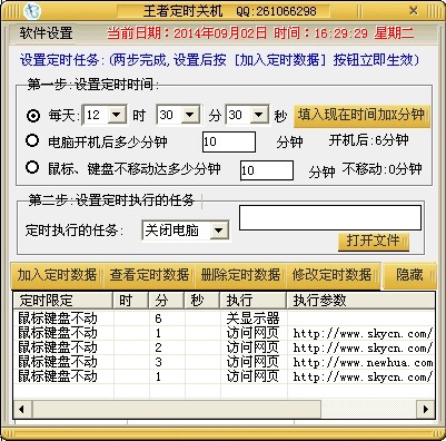 二、满足需要的各种定时选择:关闭计算机/重启计算机/注销计算机/待机计算机/休眠计算机/关闭显示器/锁定计算机/打开或者关闭文件(程序)/打开网址/定时提醒/定时播音/定时打铃/定时广播等等。