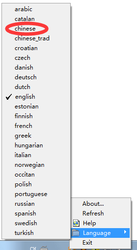 运行程序后,会在电脑右下角显示程序图标,在图标上单击右键-language-chinese,可以选择中文界面