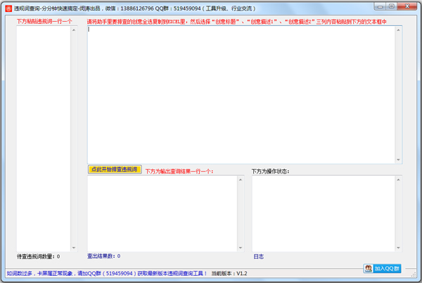 违规词查询(WeiguiciChaxun)广告创意排查工具, 这是一款可以批量查询百度搜索推广、百度网盟推广、搜狗搜索推广、神马搜索推广推广等主流搜索引擎广告创意违规词的排查工具,使用方法比较简单,可以快速帮您搞定几十万条待查词汇,规避违规广告给企业造成的经济损失和行政处罚。
