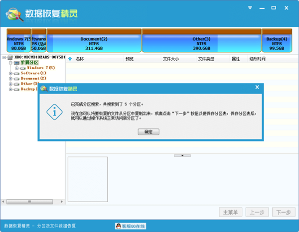 分区的大小、类型、位置信息保存在硬盘分区表中。当删除一个分区时,分区软件会将分区的大小、类型、位置信息从分区表中删除,但不会删除分区内的任何数据。因此,分区丢失后,通过一定的技术手段,是可以恢复分区的大小、类型及位置等信息的。数据恢复精灵软件就提供了这样的功能。