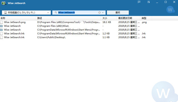 您只需输入关键字,选择要搜索的驱动器,然后单击“搜索”按钮。Wise JetSearch 会自动搜索你,然后向你展示文件/文件夹的基本细节。它比Windows中的内置搜索功能快得多。