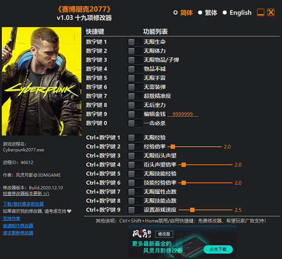 赛博朋克2077风灵月影十项修改器大神版有很强大的功能,可以修改各种游戏数据,帮助玩家更好地玩游戏。支持多种语言,点击简体、繁体、English,可以切换语言(切换语言后修改器将把该语言设置为默认语言),按Ctrl+Shift+Home,可以关闭快捷键检测,避免误按快捷键以及与游戏按键重复的情况,再按一次则重新开启。