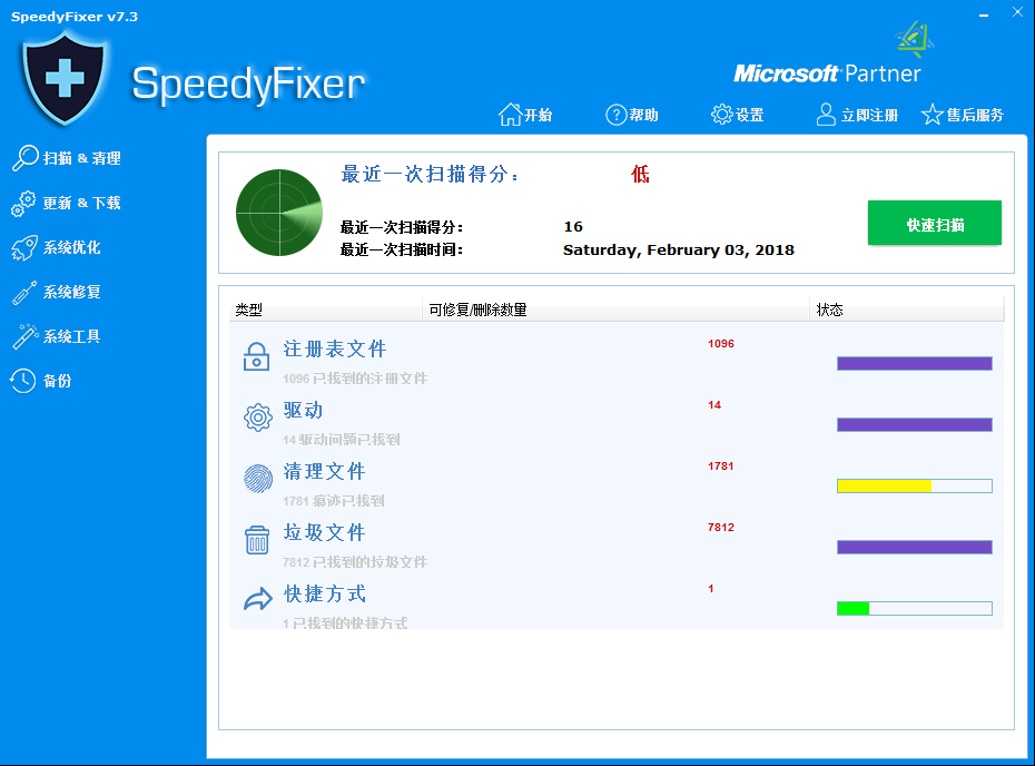 SpeedyFixer将帮助识别和修复Windows无效的注册表项。通过运行扫描和清洁作为定期维护的一部分,它将保持您的电脑免受冻结或频繁崩溃。使用它将减少您获得“蓝屏”的可能性,程序没有响应或锁定。