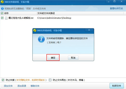答:能,因为包含在360杀毒和360安全卫士中,可供用户删除指定的文件,并且能够让用户选择“粉碎后禁止还原”和“粉碎后禁止再生”两种强制选项。