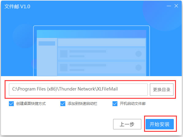 3、或者点击自定义安装,选择文件安装的位置,默认位置”C:Program Files (x86)Thunder NetworkXLFileMail“,点击开始安装;