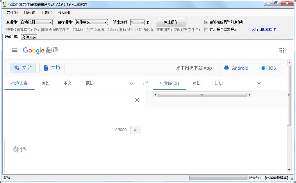 亿愿英文文件名批量翻译修改是一款快速、批量、翻译修改英文文件名的工具,采用4种翻译引擎,自动识别文件名的语言种类,把英文、日文、韩文等多种外国语言的文件名翻译成中文。