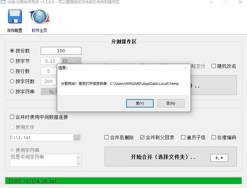 -分割功能:可以按份数分割、按字节数分割、按字符数分割、按行数分割、按字符串分割;分割文本文件时,程序会使用原始编码写出分割后的新文件。