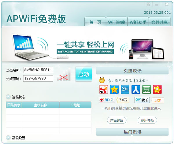 ApWiFi免费版是一款与wifi共享精灵类似,为用户快速建立一个wifi热点,只需一键为您的手机、笔记本、等各种自带wifi无线网络设备,提供高效安全简单智能的互联网访问。中英文语言、多系统平台,更加智能、傻瓜式,安全的wep加密方式,操作界面简单明了。