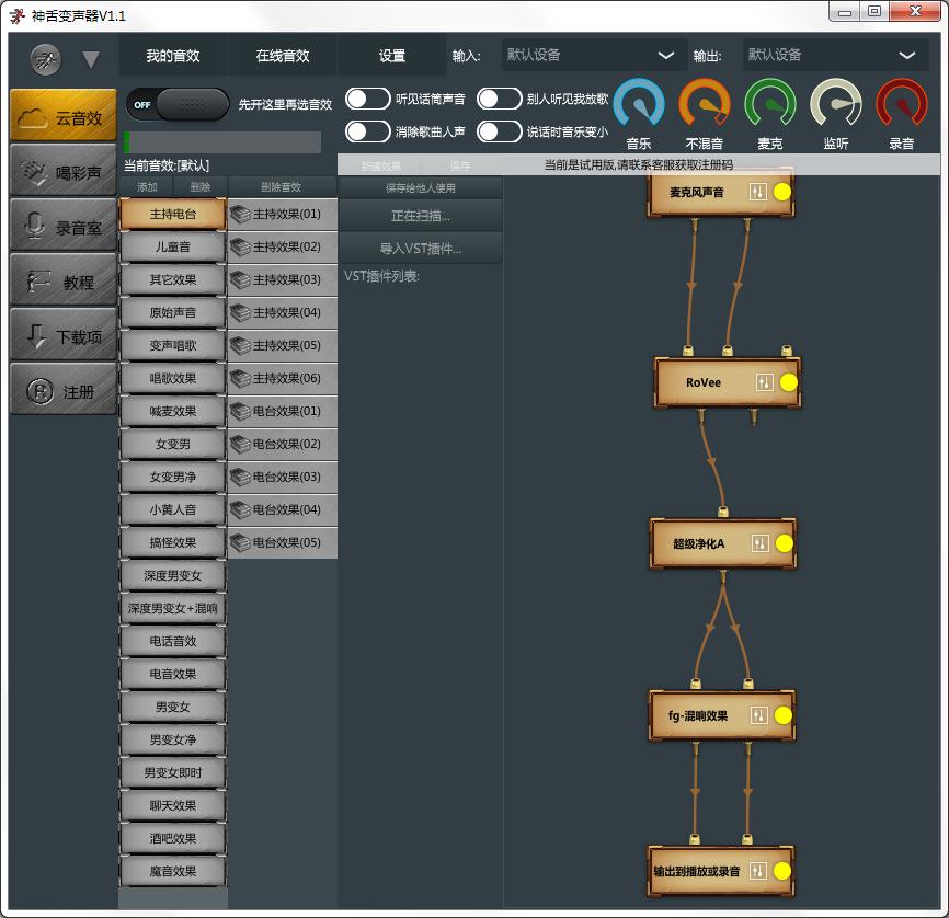 神舌变声软件官方版是一款十分优秀出色的变声软件,界面精致美观,功能强大实用,支持多种音效,支持一键变声,不仅如此,还能够对每种音效进行参数调整,并且为大家提供了vst接口,支持内嵌任何一款音频插件,并支持对插件的参数进行修改。