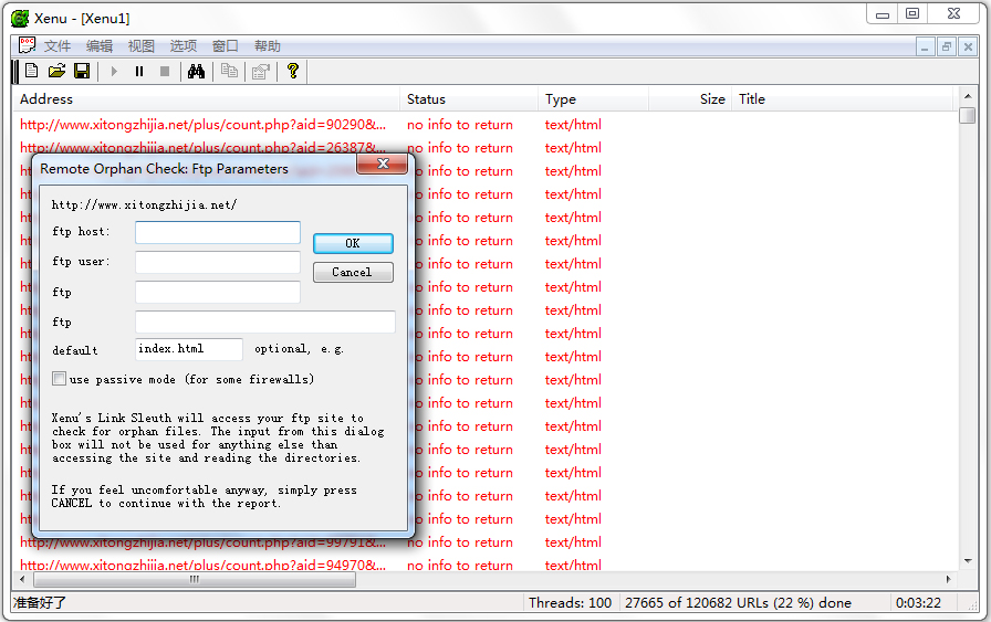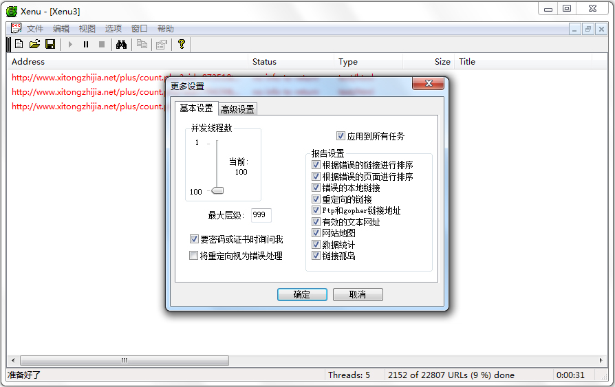 Xenu使用简单,最大支持100线程( Parallel threads),检测速度非常快。在对某网站的6层连接100630个连接进行检测时,使用默认的100线程耗仅费了1小时40分钟。当然耗费的网络资源比较多。