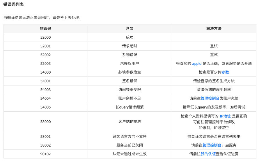 如果集成后,翻译结果出现:error: 数字,error_msg:英语,那么根据数字,在下方截图查找原因: