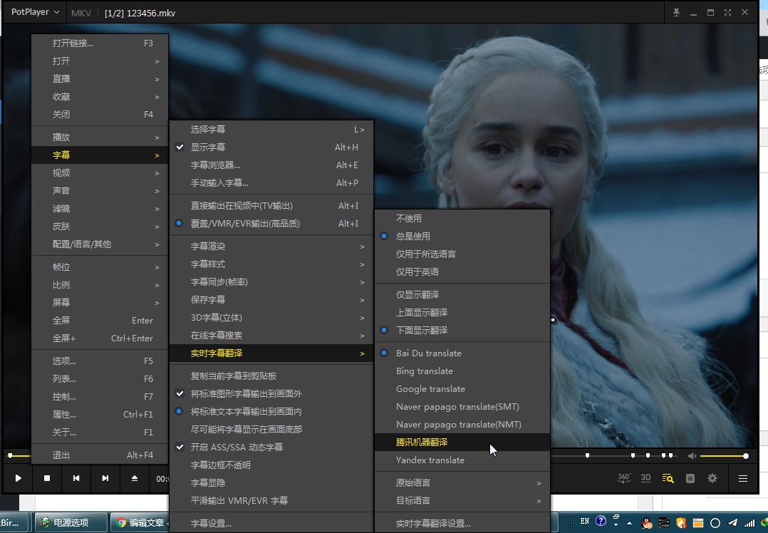 3、右键点击视频-》字幕-》在线字幕翻译-》总是使用(注:这个看个人需求)