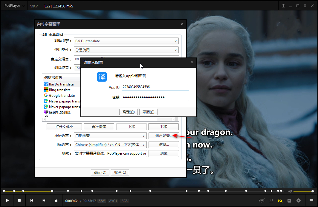 5、右键点击视频-》字幕-》在线字幕翻译-》实时字幕翻译设置-》选中百度翻译-》 点右边的 “账户设置”,会弹出一个对话框。