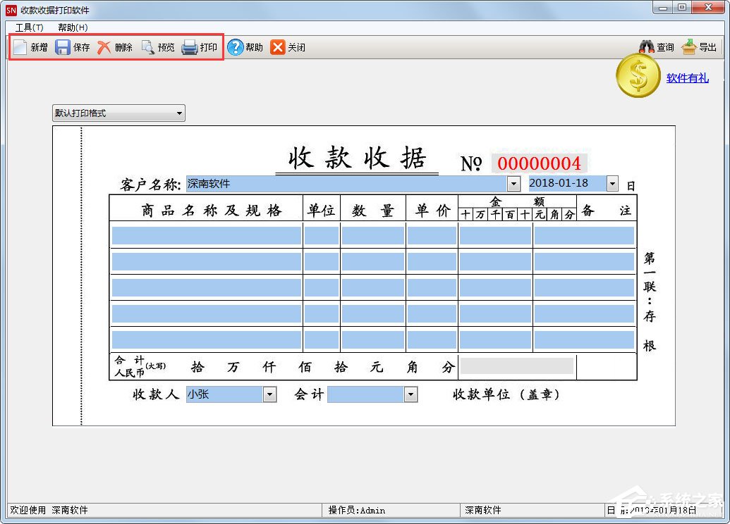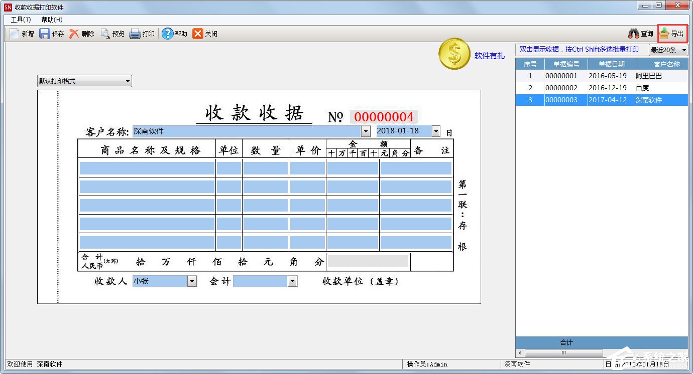 新增、保存、删除收据信息,并按打印格式对收据进行打印输出: