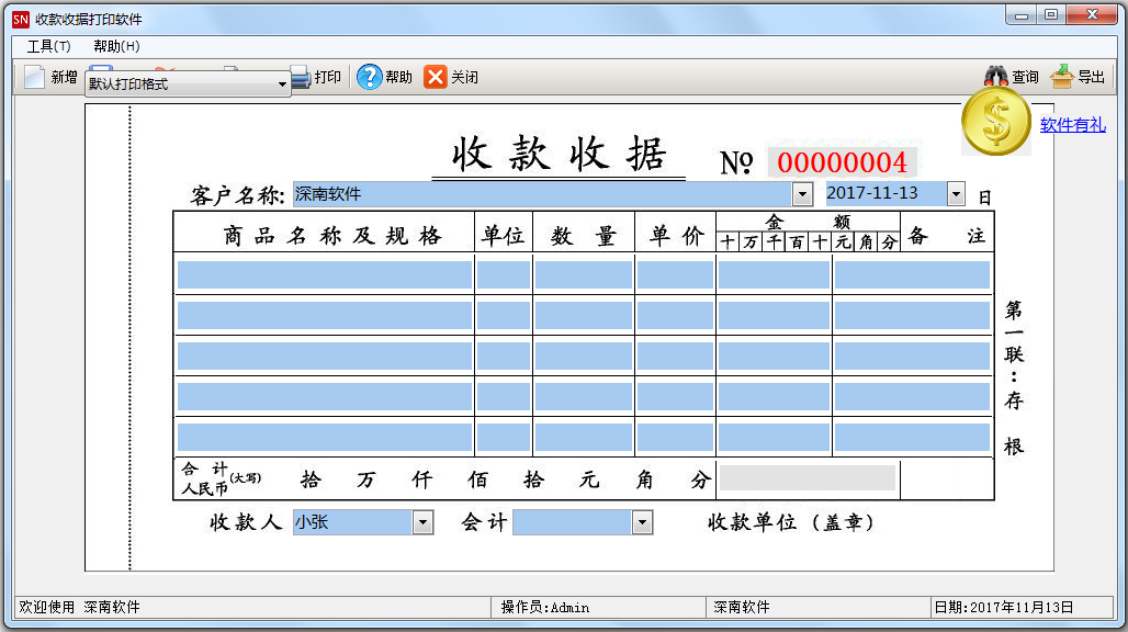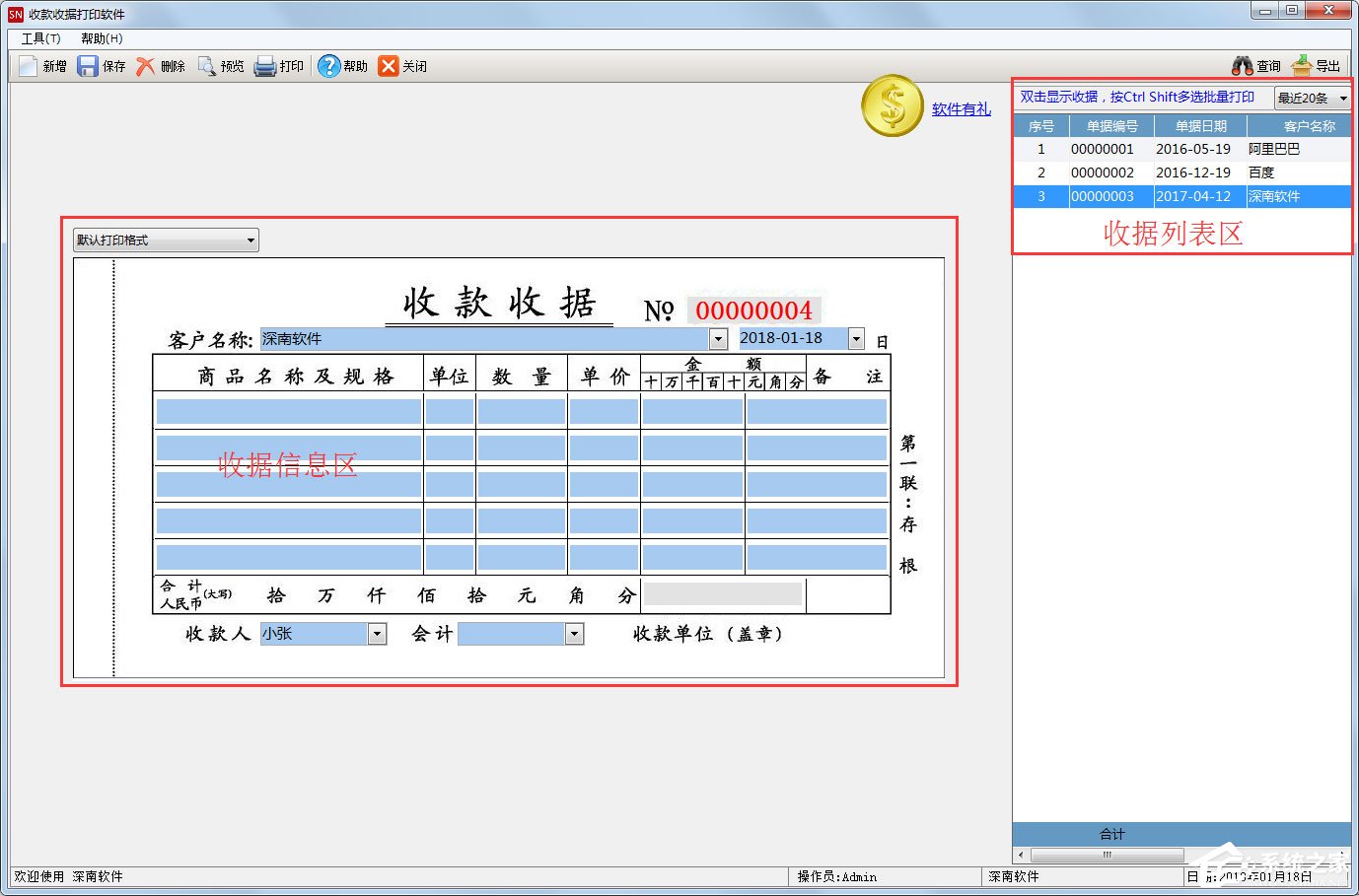 深南收款收据打印软件是一款功能非常强大的收据打印软件,这款收据打印软件拥有收据管理、统计分析、通用字典等功能,能够帮助用户对收据进行增加、修改、删除、查询、统计等操作,实现对收款收据进行信息化管理,极大的提高了管理效率。