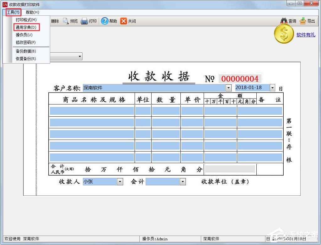 收据的录入内容可以定义在通用字典中,进行选择录入。