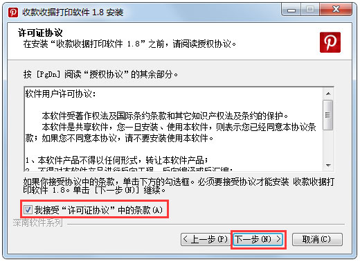 2、阅读收款收据打印软件许可协议,点击我接受许可协议中的条款后进入下一步;