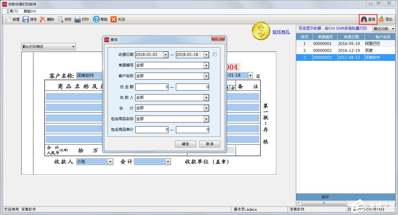 点击查询,弹出查询条件录入界面,选择或录入查询条件,并点击确定,软件会在收据列表区显示出符合查询条件的收据信息不选择或录入查询条件时,默认为查询全部收据;