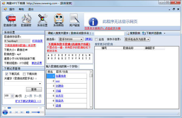 海量MP3下载器轻轻松松下载您喜爱的歌曲。您只需在软件中搜索并选中喜爱的歌曲,点击“下载所选歌曲”,即可一次性将所选歌曲下载到您的硬盘,“选择歌曲质量”、“进入下载页面”、“选择下载目录”、“为歌曲重命名”等等这些繁琐的工作全部由软件帮您完成。各种最新排行版均在软件中可以找到,您可轻松下载任何排行版中的所有歌曲。