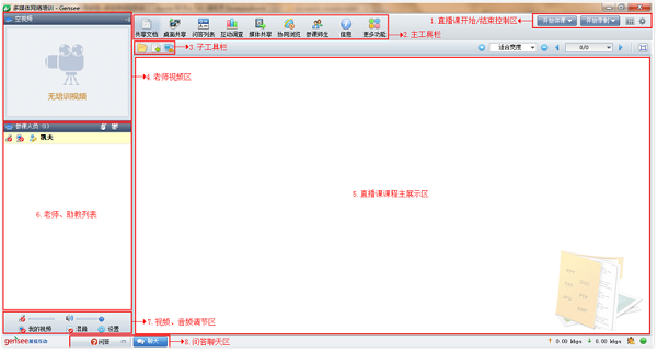 7、视频、音频调节区:调节直播课的视频与音频,客户端打开后,默认状态下音频和视频是关闭的,需要老师开启视频和话筒,耳机声音。