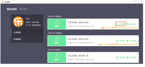 完成登录后进入“我的课程”界面,选择需要上的课,点击【进入教室】按钮进入老师客户端。
