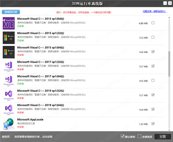 3DM运行库是一款非常全面和丰富的游戏运行库,它拥有互联网中最新最全的游戏必备运行库,而且在用户玩游戏的时候自动识别系统的版本为用户提供适合游戏的各种组件,支持离线安装。不管是单机游戏、网络游戏都可以很好运行。