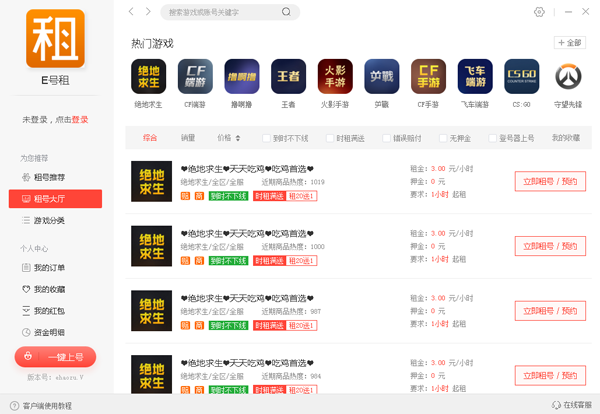 E号租是一款专业的游戏账号租借平台,用户可以在平台上进行游戏账号的出租、租用、买卖账号等,远程协助输入账号密码,马上游玩。租号玩上号器官方版还有屏蔽恶意插件以及反外挂功能,不用担心自己的账号有封号风险。有需要的小伙伴快来下载使用吧!