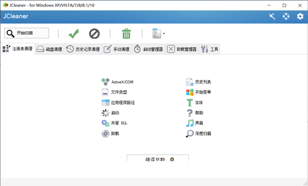 1、JCleaner支持三种清理功能,包括磁盘清理,注册表清理和历史记录清理。