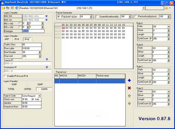 AnySend是一款功能强大的数据发包工具,软件主要可以获取接口的列表供用户选择,还可以单独打开某一个接口,还可以将刚刚创建的报文进行发送给指定用户。而报文的格式包括了arp、rarp、ipv4、ipv6、icmpv4、icmpv6、igmp、udp、tcp、pim、ospf、rip、snmp、ppp、pppoe、ipsec(ah/esp)等。