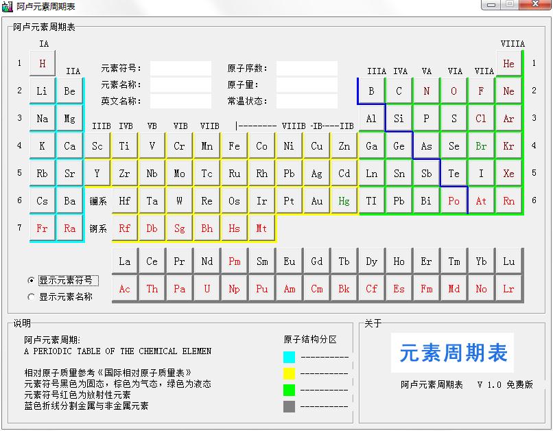 2、可以显示元素符号、原子序数、元素名称、原子量、英文名称、常温状态等参数。