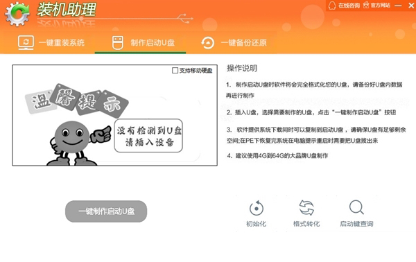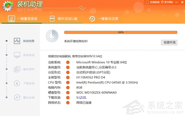 装机助理是一款非常好用的系统重装工具,这款软件可以帮助用户轻松的检测电脑网络环境,同时软件还可以帮助用户轻松的实现在线一键重装电脑,而且软件还为用户提供了制作U盘启动的工具,让用户可以进入pe中重装电脑系统。