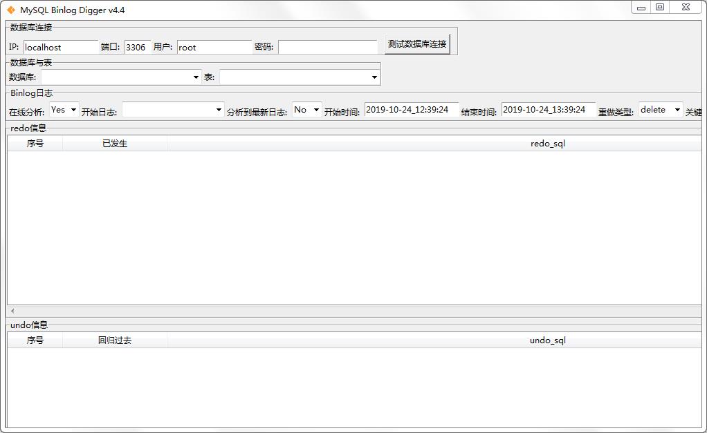 MySQL Binlog Digger基于图形界面,绿色免安装,能对在线binlog与离线binlog进行分析,在选定在线binlog或离线binlog日志后,可对数据库、表、binlog开始时间、binlog结束时间、误操作的重做类型进行信息分析。