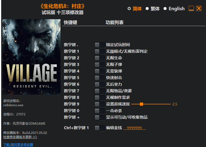 生化危机8村庄风灵月影修改器 V1.0 3dm版
