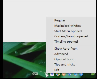 在本站下载后只需解压打开软件即可运行,软件运行时会在托盘隐藏,如果您需要更改颜色设置等操作亲在托盘更改。通常我们只需要设置任务栏在下面3种情况下的效果即可,这三种情况也对应名称相同的菜单项。