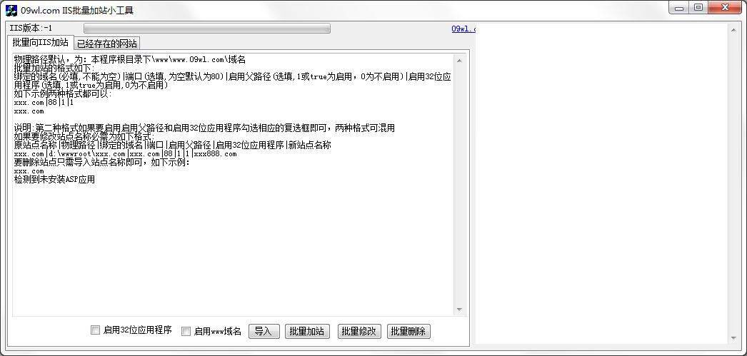 1.使用此程序可以在IIS批量加站、批量修改网站、批量删除网站。