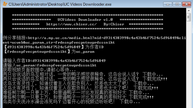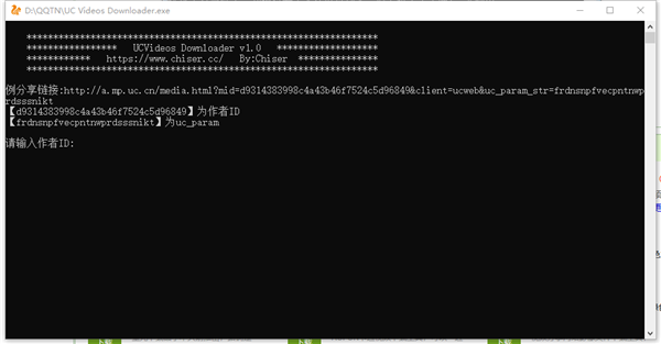 在UC浏览器中分享作者主页页面,通过复制链接中提取作者ID及uc_param,分别输入回车即可使用。