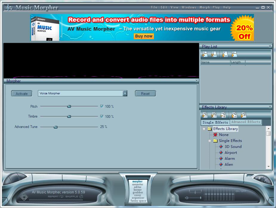 AV Music Morpher 界面设计简单明了,你可以对音乐文件进行简单的裁剪剪贴编辑,音乐文件格式转换,也可以添加诸如室内、室外、房间、演唱会、浴室等环境音效,还能进行混音,模拟DJ工作等,另外还能编辑刻录音乐光盘,制作音乐专辑,添加个性专辑封面等等功能。