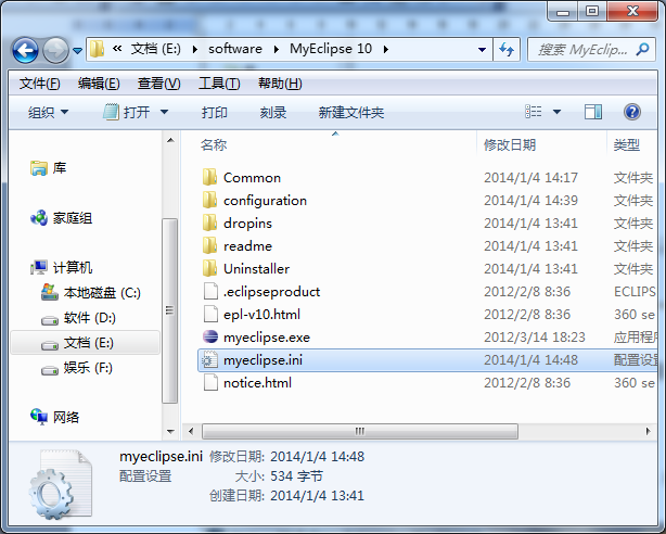 5、找到MyEclipse 10的目录下找到myeclipse.ini文件,文件就图四的里面的位置。用记事本打开在最后一行加多一条语句