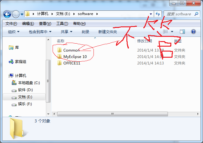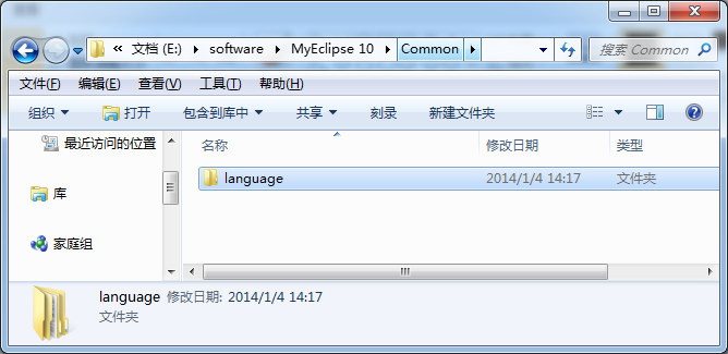 1、把汉化包里的language的文件夹复制到MyEclipse 10里面的Common文件夹里(一般里面是没有Common这个文件的,如果没有自己创建一个)。看准了 在MyEclipse 10同级下也有一个Common文件我们汉化整个过程都不要动它(图一),正确的是在MyEclipse 10里面的Common文件夹,比如我的路径就是E:softwareMyEclipse 10Common(图2)