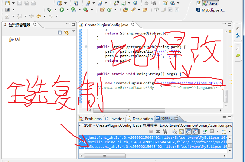 3、运行MyEclipse软件创建一个项目,在项目里面建立一个CreatePluginsConfig类,把上面的代码复制进去,记得修改你的插件路径。