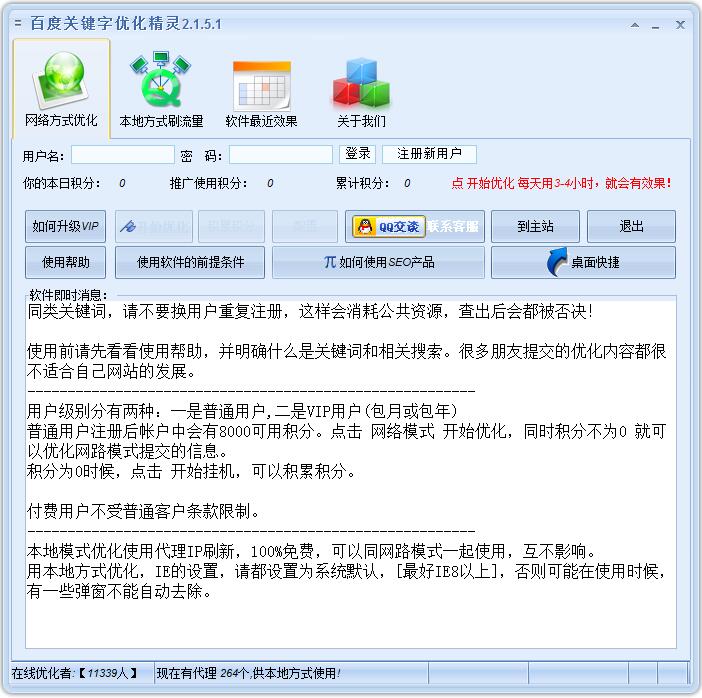 百度关键字优化精灵是一款采用p2p互助理论开发的搜索引擎关键词优化工具,提升网站排名稳定迅速,同时也能给你网站代理巨大流量,刷关键字排名、刷流量。